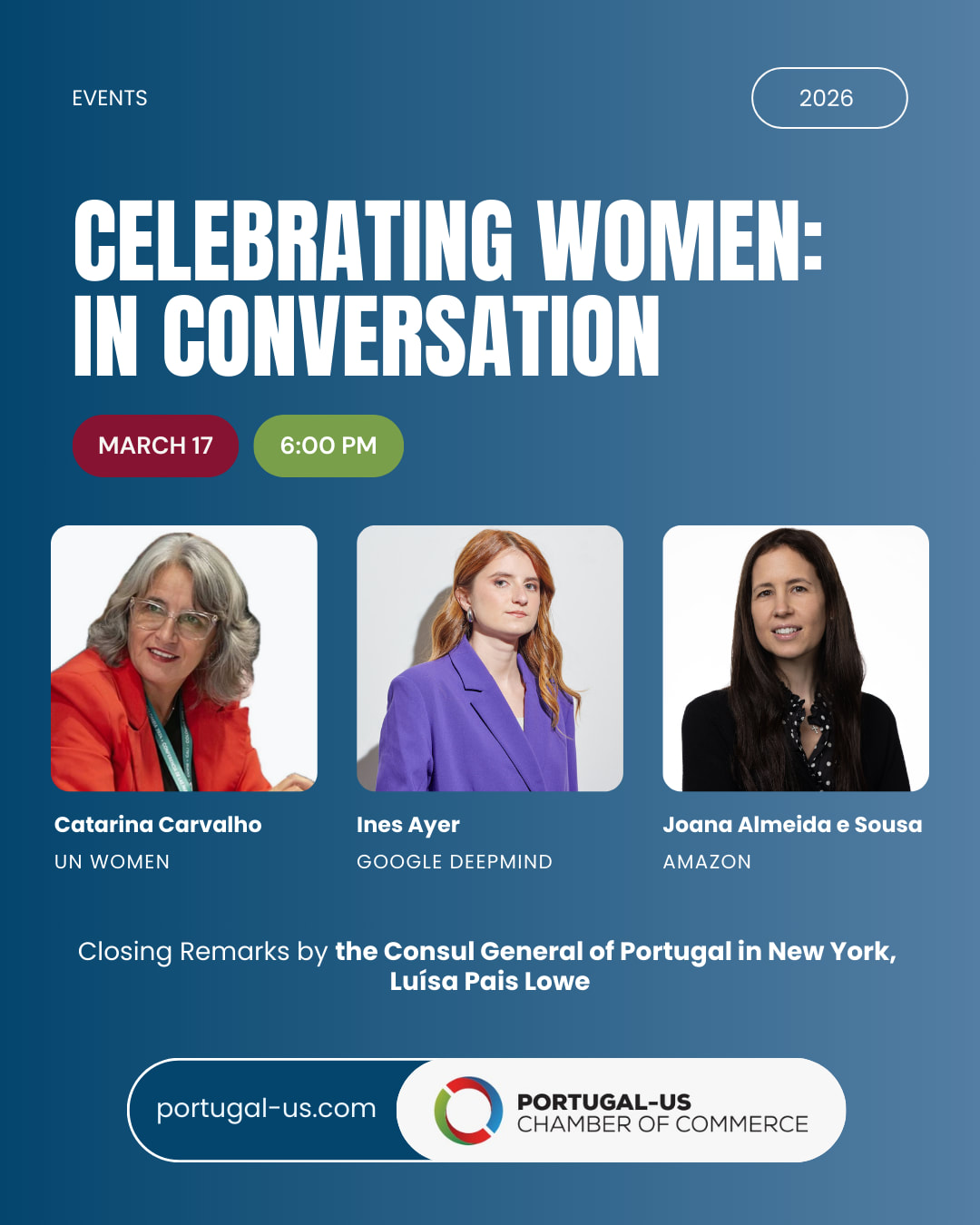 On March 17 at 6 PM, Catarina Carvalho (UN Women), Ines Ayer (Google DeepMind), and Joana Almeida e Sousa (Amazon) will share their journeys, insights, and lessons learned, helping inspire more women to take the leap to the US. We will also have the honor of welcoming the closing remarks of the Consul General of Portugal in New York, Luísa Pais Lowe.
